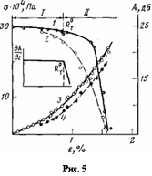 В следующем эксперименте зондирующий импульс направлялся вдоль оси нагружения, что повышало его чувствительность к образованию трещин. Режим нагружения ступенчатый. Точность измерения удлинений ±0,3-10-8 м, коэффициента ослабления — ±0,2 дБ, скорости распространения акустического возмущения — ±3 м/с. Измерения выполнялись при 20°. Как следует из экспериментальных зависимостей рис. 5, при деформациях до 1% наблюдается слабое (1—2 дБ) уменьшение амплитуды проходящего сигнала. В пределах точности эксперимента ослабление изменяется обратимо. При дальнейшем увеличении деформации от 1,2 до 1,7% изменение амплитуды составляет более 20 дБ. Именно такое резкое изменение зависимости амплитуды акустического импульса от деформации позволяет установить верхнюю условную границу микроразрушения Лт° и граничные значения е и о*. При повторной нагрузке деформационная кривая 4 оказывается смещенной в сторону больших деформаций, что свидетельствует о возникновении необратимых изменений структуры. Зависимость A=f(e) также смещается при повторном нагружении (кривая 2), но при этом изменяется и ее вид. После многократного [10] растяжения до е=1,7°/о в образце появлялась область повышенного ослабления акустического сигнала (аиз6«19 дБ на частоте 2,5 МГц). Таким образом, с помощью акустического метода выявлены области квазиобратимых (I) и необратимых (II) изменений, определена верхняя условная граница микроразрушений.