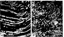 Рис. 6. Продольные срезы с экструдатов смесей ПЭ-1 — ПС-1 (а) и ПЭ-2 - ПС-1 (б) при Т=6,8104 Па