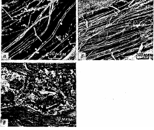Рис. 4. Микрофотографии волокон ПЭ-3, полученных в смеси с ПС-1, при Т=1,0-•103 Па (а), а также в смеси с ПС-3 при т=6,8-104 Па (б); в - продольный срез, с экструдата смеси ПЭ-3 - ПС-1 при т=1,0105 Па