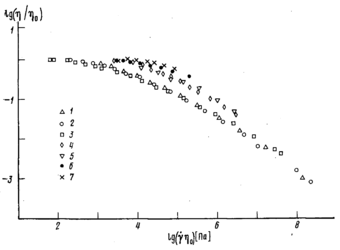 На рис. 3 приведены результаты такого обобщения для изученных смесей. В тех случаях, когда ньютоновское течение смесей не было достигнуто, величины rjo определяли по данным рис. 2 методом экстраполяции зависимости lg ц—х на т=0. Из рис. 3 видно, что при использовании одного ПС и разных типов ПЭ достигается инвариантное описание полученных данных. При переходе к смесям на основе ПС-2 и ПС-3 получаются более пологие кривые, что обусловлено, по-видимому, более узким ММР этих образцов ПС по сравнению с ПС-1. Все это свидетельствует о возможности инвариантного описания течения полимерных двухфазных смесей исходя из представления о некотором характерном времени релаксации системы, лежащем в основе рассматриваемого метода [14].