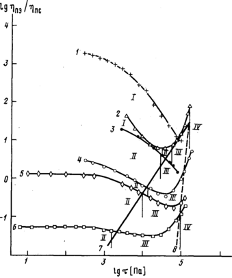 Обращает на себя внимание проявление волокнообразования в изученных смесях в области, ограниченной прямыми 7 и 8, независимо от того, растет или снижается величина отношения в зависимости от напряжения сдвига. Этот факт свидетельствует, по-видимому о том, что в области больших т ведущую роль в волокнообразовании могут играть не касательные, а растягивающие напряжения, сравнимые по величине со значениями т, действующими на входе в капилляр [17].