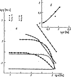 На рис. 1, а приведена зависимость вязкости ПЭ и ПС от напряжения сдвига. Видно, что все образцы, за исключением ПС-3, проявляют ярко выраженное неньютоновское течение. При изменении молекулярной массы ПС и ПЭ вязкость может изменяться на два-три десятичных порядка. В отличие от вязкости величины модуля высокоэластичности изученных полимеров практически одинаковые и возрастают с увеличением напряжения сдвига (рис. 1, б).