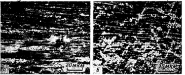Анализ полученных данных показывает, что в области напряжений, соответствующих развитому волокнообразованию, морфология экструдата в целом существенно зависит не только от отношения, но и от абсолютной величины вязкости компонентов, т и от однородности распределения частиц ПЭ в исходной смеси. Так, смешивание высоковязких ПЭ-1 и ПС-1 приводит к образованию сравнительно толстых, значительно различающихся по диаметру волокон. Снижение вязкости ПЭ при переходе к смеси ПЭ-2 — ПС-1 приводит к образованию более тонких и однородных по диаметру волокон, что видно из сравнения микрофотографий продольных срезов с экструдатов этих смесей (рис. 6). Высокой однородностью по диаметрам обладают волокна и в смеси ПЭ-3 — ПС-3 (наименее вязкий ПЭ), имеющей значение Ткр, близкое к величине Ткр смеси ПЭ-1 — ПС-1 (рис. 5). Увеличение напряжения сдвига приводит также к образованию более тонких волокон в данной смеси. В целом в зависимости от разных факторов в смесях ПЭ — ПС образуются волокна со средним диаметром 2—7 мкм.