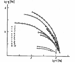 Рис. 2. Зависимость вязкости смесей ПЭ и ПС от напряжения сдвига: 1 - ПЭ-1 - ПС-1 (А); 2- ПЭ-2 - ПС-1 (А); З-ПЭ-З-ПС-1 (А); 4 -ПЭ-2 -ПС-1 (Б); 5-ПЭ-З-ПС-2 (Б); 6-ПЭ-2-ПС-2 (Б); 7-ПЭ-2-ПС-3 (Б); S-ПЭ-З-ПС-З (Б); 9-ПЭ-2-ПС-1 (В) и 10-ПЭ-2-ПС-1 (Г)
