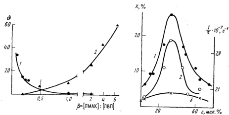 Другим примером многокомпонентных систем являются интерполимерные комплексы. Изучение динамики полимерных цепей в интерполимерных комплексах позволяет получить информацию как о закономерностях протекания межмакромолекулярных реакций, так и о составе и структуре интерполимерного комплекса. Возможность решения круга вопросов, связанных с образованием и структурой интерполимерных комплексов, на основе изучения динамики взаимодействующих полимерных цепей связана с существенным различием динамических характеристик макромолекул в растворе и в интерполимерном комплексе. Времена релаксации при образовании поликомплекса возрастают на 1—2 порядка [18].