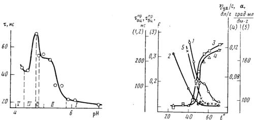 Рис. 5. Зависимость т от рН для сополимера глутаминовой кислоты и лейцина (83 — 17 мол.%) в воде при 25° [10]. Области: I — клубок; II—IV — формирование внутренней структуры: а-спирали (II), компактной структуры (III), глобулы (IV); V — межмакромолекулярные ассоциаты Рис. 6. Температурные зависимости (для ПХМ-10 в гептане) т0цпр (1), ТбЦпр (2), вклада / высокочастотных движений (3), т|уд/с (4) и оптической активности [а] (5); г) „р=0,38 сП