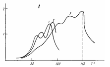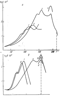 В ПХМ-10 температурное положение промежуточного мезофазного перехода (124°) совпадает с пиком диэлектрических релаксационных потерь (ниже он будет обозначен цифрой 1) при высоких частотах (рис. 2, б). Наблюдаемую при этих температурах область tg 6MaKc отличает значительная размазанность по температуре, что можно рассматривать как следствие наложения релаксационного процесса и мезоморфного структурного перехода. Естественно, что такое заключение может быть сделано только при наличии прямых данных ДСК [1].