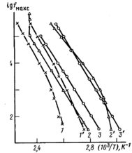 Рис. 3. Зависимость lg /макс от обратной температуры для релаксационных процессов I (1-3) и II Ц'-З') в ПХМ-5 (1, Г), ПХМ-10 {2, 2') и в ПХМ-14 (3, 3')
