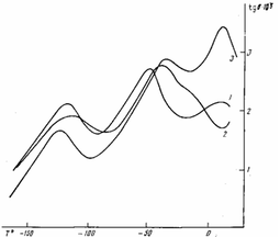 Наличие двух полярных групп приводит к тому, что при низких температурах для всех изученных полимеров наблюдали три области прохождения tg б через максимум (рис. 1). Координаты самой низкотемпературной области релаксации (—120°) близки к таковым для акрилатного и метакрилатного рядов полимеров гребнеобразного строения [3]. Эту область диэлектрических потерь можно связать с подвижностью сложно-эфирных групп, смежных с основной цепью, и примыкающих к ним нескольких групп СН2 боковой полиметиленовой цепочки.