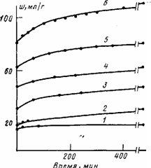 Анализ кинетических кривых набухания [3] показывает, что при прочих равных условиях характерное время набухания т зависит от размера частиц образца. В частности, при свободном набухании в воде для образцов с равновесной степенью набухания 1 л/г и исходным радиусом частиц от 0,25 до 0,5 мм величины т составляют от 11 до 42 мии. Отсюда возникает требование снижения размера образца и оптимальным оказываются частицы радиусом ~0,5 мм, что обеспечивает измерение равновесного набухания за период ~5т, т. е. за 200 мин.