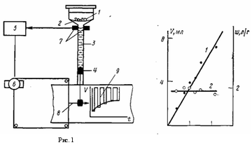 Рис. 1. Прибор для автоматической регистрации набухания гидрогелей. Зависимость объема V жидкости (10~4 н. раствор NaCI), поглощенном при набухании (1) и степени набухания w (2) от массы образца Л