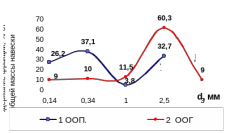 Измельченные ООГ и ООП имеют гранулометрический состав представленный на рис. 3 и неправильную форму частиц.