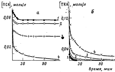 Исходи из данных по предельной степени превращения персульфата калия (ПСК) под действием различных количеств ТКА было показано, что в отсутствие каких-либо добавок ПСК реагирует с ТКА в соотношении 1:2. Однако из кинетических кривых (рис. 1), полученных при разных соотношениях реагентов, видно, что в начальный период ПСК и ТКА расходуются в эквимольном соотношении, а дополнительное количество ТКА вступает в реакцию лишь после того, как значительная часть ПСК уже прореагировала. На основании этих данных можно заключить, что
