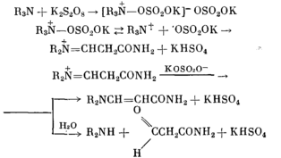происходит через промежуточное образование катион-радикала R3NT и радикала KOS020 , которые при отсутствии акцепторов радикалов реагируют с образованием енамина, вторичного амина и альдегида, а также бисульфата калия. Последний нейтрализует третичный амин и переводит его в неактивную по отношению к ПСК форму. Очевидно, что и продукты реакции (енамин и вторичный амин) подобно ТКА реагируют с бисульфатом калия и находятся в реакционной смеси в виде солей.