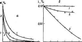 Рис. 3. Кинетические кривые расхода акриламида (а) и персульфата калия (б) в ходе полимеризации без добавок (1), в присутствии 0,035% ТКА (2) и 0,55% аммиака (3). Вода, 50°