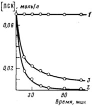 Подтверждением того, что протонированный ТКА не вступает в окислительно-восстановительную реакцию с ПСК, явился опыт с добавкой к смеси указанных веществ бисульфата калия в количестве, достаточном для нейтрализации ТКА, при этом содержание ПСК в смеси не менялось (рис. 2). Напротив, при проведении реакции в щелочной среде (с добавкой эквимольного по отношению к ПСК количества КОН) ход кинетической кривой убыли ПСК (рис. 2) показывает, что до глубоких степеней превращения ПСК взаимодействует с ТКА в соотношении 1 : 1 вследствие нейтрализации бисульфата калия более сильным, чем