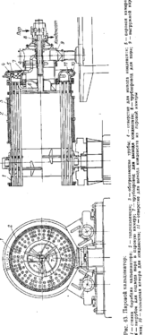 Конденсат из труб стекает в паровую камеру и из нее через ряд отверстий — в кольцевую камеру конденсата 10, которая разделена перегородками на три секции. Каждая перегородка с одной стороны имеет упомянутые выше отверстия для стока конденсата, а с другой — отверстие 4 и трубопровод 7 для вывода конденсата из кальцинатора. Попавший в секцию при нижнем ее положении конденсат в процессе вращения барабана вытекает с другого конца секции по трубопроводу 7 и далее выводится из кальцинатора.