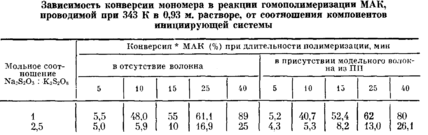 С целью выяснения особенностей прививочной полимеризации МАК к ПКА-волокну, протекающей с относительной высокой скоростью и не сопровождающейся отдельно образованием гомополимера, была исследована реакция гомополимеризации МАК в аналогичных условиях в отсутствие волокна, а также в присутствии модельного ПП-волокна (в принятых условиях реакция передачи цепи на ПП не протекает).