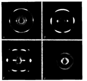 Рентгенограммы мезоморфного состояния ПФ характеризуются наличием очень интенсивного первого максимума и трех значительно более слабых рефлексов на экваторе и сильными, по широкими рефлексами первой слоевой линии (рис.1,). Подобный характер дифракционных картин типичен для случая мезоморфного состояния, описанного в частности, для полидиэтилсилоксана [0] и ПЭ [7].