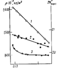 Рис.5. Зависимость плотности (i) и положений экваториального (2) и меридионального (3) диффузных рефлексов ПФ от температуры кристаллитов.