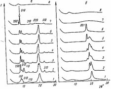 Рис.3. Изменение картин рассеяния кристаллических модификаций ПФ при нагревании а: а-фаза, (100) и (010) рефлексы (7 - 293, 2-313, 3-323, 4 - 333,,5 - 338, 6 - 343 К); б: (-фаза, (200), (010) и (НО) рефлексы (1 - 293, 2 - 343, 3 - 348, 4 - 360, 5 - 363, 6 - 365 К)
