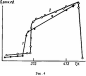 Конечное состояние образца после охлаждения определяется максимальной температурой отжига в цикле. На рис.2 показаны изменения экваториальных и меридиональных дифрактограмм после отжига при различных температурах. На экваториальных дифрактограммах с увеличением температуры отжига происходит некоторое перераспределение интенсивности рефлексов (при общем сохранении числа рефлексов, отвечающих γ-решетке), свидетельствующее о совершенствовании структуры кристаллов ПФ. Особенно отчетливо влияние обжига сказывается па картинах меридионального рассеяния, где начиная с 433 К разрешается рефлекс (001). Оценка продольных размеров кристаллитов по полуширине указанного максимума дает минимальное значение величины ~70 им. Это прямое подтверждение наличия кристаллов с выпрямленными цепями в подобной системе.