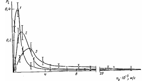 На рис. 2 представлены кривые распределений микротрещин по линейным скоростям роста для трех скоростей деформирования. Как видно, кривые распределения асимметричны по форме и имеют четко выраженный максимум, соответствующий наиболее вероятной линейной скорости роста микротрещин.