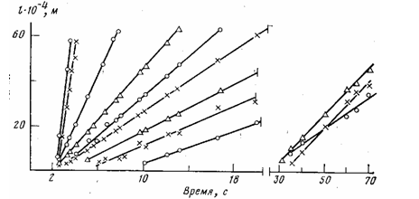 Позднее было установлено, что процесс холодной вытяжки полимера в адсорбционно-активной среде, несмотря на отмеченные выше отличия, имеет много общего с хорошо изученным процессом деформации полимера на воздухе [9]. Хотя при растяжении полимера в адсорбционно-активной среде не происходит образования монолитной шейки, пластическая деформация полимера на первых этапах растяжения осуществляется в области вершин специфических микротрещин, прорастающих (так же, как и шейка) через поперечное сечение деформируемого полимера. Такая аналогия позволила определить скорость роста микротрещин или, что то же, скорость распространения зоны пластической деформации в полимере при его растяжении в адсорбционно-активной среде. Действительно, поскольку к моменту выхода динамометрической кривой в область стационарного напряжения большая часть микротрещин успевает прорасти через все поперечное сечение образца, то, фиксируя время выхода динамометрической кривой на плато и зная размеры образца, можно определить некоторую скорость роста микротрещин. Было показано, что скорость роста микротрещин зависит от вязкости и поверхностной активности жидкой среды, а также определяется условиями нагружения полимера [12].