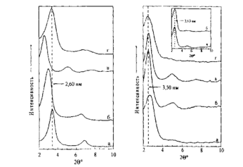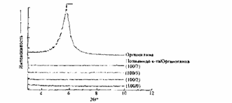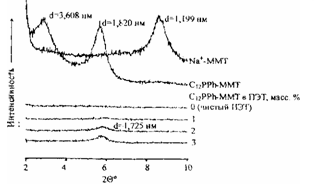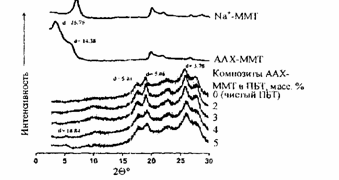 Один из основных методов изучения структуры нанокомпозита на основе слоистого силиката основан на определении межслойного пространства с помощью рентгеноструктурного анализа исходного и модифицированного слоистого силиката, а также для конечного полимерного нанокомпозита. Дело в том, что для этих глин в чистом виде характерен пик в малоугловой области (2в = 6-8°). Этот пик отвечает за упорядоченность в структуре силиката. Для органомодифицированных глин характерно смещение данного пика в сторону уменьшения значения 2Э. Для полимерных нанокомпозитов при хорошем распределении частиц глины по объёму полимерной матрицы, этот пик исчезает, что говорит об исчезновении характерной упорядоченности в структуре слоистого силиката. Если количество глины превышает некоторый предел распределения её в полимерной матрице, пик появляется вновь. Данная закономерность продемонстрирована на примере полибутилентерефталата(ПБТ) (рис. 4)[11].