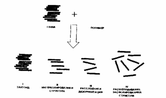 Изучение распределения органоглины в полимерной матрице имеет большое значение, так как свойства получаемых композитов напрямую зависят от степени распределения органоглины. Согласно работам Джианелиса [21] процесс формирования нанокомпозита протекает через ряд промежуточных стадий (рис. 3). На первой стадии происходит образование тактоида - полимер окружает агломераты органоглины. На второй стадии происходит проникновение полимера в межслойное пространство органоглины, в результате чего происходит раздвижение слоев до 2-3 нм [22]. Дальнейшее увеличение расстояния между слоями (третья стадия) приводит к частичному расслоению и дезориентации слоев органоглины. Эксфолиация или расслоение наблюдается, когда полимер раздвига слои глины на 8-10 нм и более.