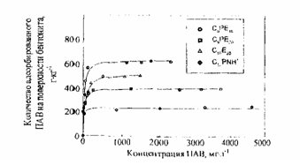 Как правило, наименьшая степень десорбции (рис. 2.II) наблюдается в случае неионного взаимодействия между поверхностью глины и органического модификатора. По всей видимости, водородные связи, образованные между этиленоксидной группой и поверхностью глины делают эти органоглины химически более стабильными, чем органоглины полученные по ионному механизму.