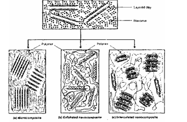 Рис. 13. Получение полимерного нанокомпозита в процессе синтеза самого полимера (in situ) (а) - микрокомпозит, (Ь) - эксфолированный (расшелушенный) нанокомпозит, (с) - интеркалированный нанокомпозит [51]