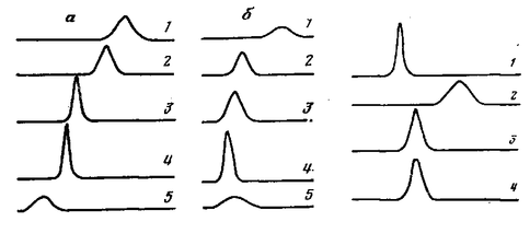 Рис. 1. Седиментограммы смесей IlMANa - ПВП (а) и ПДМАЭМА - ПФ (б), а: ф= =0,45 (1) 0,33 (2), 0,2 (5), IIMANa (4), ПВП (5); рН 7,5; время 90 мин; [NaCl] = =0,05 моль/л; б: ф=0,33 (1), 0,2 (2), 0,1 (3),_ПДМАЭМА (4), ПФ (5); рН 4,0; время 60 мин; [NaClJ =0,1 моль/л. Мю пф=1,7-10 Мт пдмаэма-нс1=6,3-105; скорость вращения ротора 5,6-Ю4 об/мин; 20° Рис. 2. Седиментограммы НПЭК nMANa - ПВП, nMANa и их смеси: nMANa (1); НПЭК (ф=0,45) (2); смесь [(1) + (2)] (3); НПЭК (ср=0,23) (4). Условия те же, что на рис. 1, а