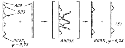 Специальный интерес представляет изучение механизма переноса цепей БПЭ с одних цепей ЛПЭ на другие. Поскольку, как показано, например, в работе [7], в растворах исследованных НПЭК не удается обнаружить свободные полиэлектролиты, при рассмотрении переноса цепочек БПЭ из одних частиц НПЭК на другие стадию диссоциации НПЭК