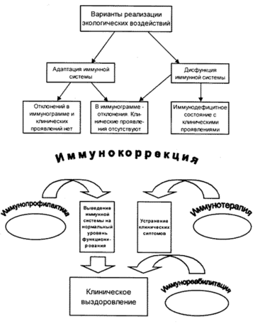 Мы считаем, что в условиях экологического неблагополучия, в зависимости от состояния адаптации или срыва адаптационных механизмов, необходимо проведение мероприятий, направленных на нивелирование экогенного воздействия на иммунную систему. Одно из важных преимуществ экологической иммунологии по сравнению с другими дисциплинами клинической иммунологии состоит не столько в фиксации факта неблагополучия, сколько в реальных возможностях иммунокоррегирующей терапии, которая во многом способна нивелировать экологически неблагоприятное воздействие на организм. В зависимости от ситуации это может быть иммунопрофилактика, иммунореабилитация или иммунотерапия. С нашей точки зрения, именно здесь происходит слияние понятий "экологическая" и "клиническая" иммунология.