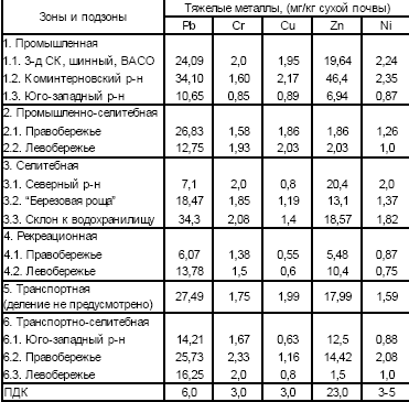 Как видно из таблицы 2, во всех подзонах не наблюдается превышения ПДК по Cr, Сu, Ni, хотя его содержание варьирует в разных местах в 1,5-2 раза. Лишь по Zn наблюдается аномальное превышение в Коминтерновском районе (в 2 раза выше ПДК).