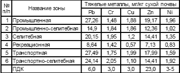 Как видно из таблицы 1, в верхнем 10 см слое почв содержание изученных подвижных форм ТМ (Сг, Сu, Zn, Ni) не превышает ПДК. Однако, во всех случаях содержание подвижных форм свинца в 1,4-4,6 раза больше. Особенно высокие превышения по Рb наблюдаются в транспортной, транспортно-селитебной и промышленной зонах, а наименьшие – в рекреационной зоне. Вызывает некоторое недоумение высокое содержание Рb в селитебной зоне по сравнению с промышленной, однако это легко объясняется насыщенностью этой территории легковыми автомобилями, которые в настоящее время составляют 85% от всего автотранспорта.