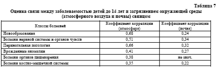 Для оценки значимости влияния загрязнения окружающей среды свинцом на отдельные классы болезней детского населения нами были рассчитаны коэффициенты корреляции между загрязнением и заболеваемостью (табл. 7) [5].