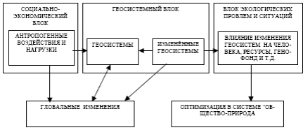Прогнозирование экологических ситуаций является наиболее сложной в структуре мониторинга (рис. 3). Оно включает три блока, объединенных целевым назначением: социально-экономический, геосистемный и экологических проблем и ситуаций (прогноз влияния изменения природной среды) и экологических проблем и ситуаций (прогноз влияния изменения свойств ландшафтов на условия проживания людей и состояние их здоровья, природно-ресурсный потенциал, генофонд и т.д.). Разработка прогноза каждого из названных блоков является самостоятельной задачей. При системном же подходе они имеют общую цель – суждение о состоянии экологической ситуации в будущем (ее пространственных и временных масштабах и степени остроты [5,8,16].