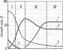 фазы: / — аэробная, // -- анаэробная, не образующая метана, /// — нарастающая анаэробная, метанобразующая, IV - стационарная анаэробная, метанобразующая
