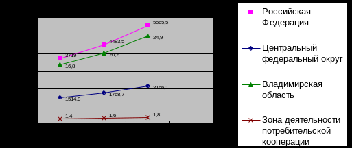 Потребительская кооперация Владимирской области представляет собой хозяйственную и общественную систему, на целенную на удовлетворение потребностей как членов-пайщиков потребительских обществ, так и всего населения области. Сегодня в 30 районных и потребительских обществах Владимирской области насчитывается 136,4 тыс. членов пайщиков. Система потребкооперации является основной торгующей организацией на селе, обслуживая более 1767 тыс. населенных пунктов, с населением 387,9 тыс. человек или более 25 процентов населения области. В кооперативных предприятиях и организациях трудятся около 6 тыс. человек2.