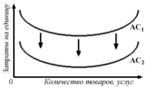 Величина транспортных издержек фирмы зависит от существующей транспортной сети и близости ресурсов и рынков сбыта. Стремясь сократить издержки, фирмы выбирают местоположение вблизи дешевых транспортных узлов, природных либо созданных человеком. Возросшая специализация производства заставляет промышленно связанные фирмы находится в непосредственной близости друг от друга, так как в этом случае они могут добиться существенной экономии на издержках транспорта и связи. Если ряд фирм объединится, то они как группа могут достичь более низкой цены на ресурсы, а следовательно, этот фактор экономии позволяет добиться смещения вниз кривой издержек отдельной фирмы, что невозможно при географической разбросанности (Рис. 2).