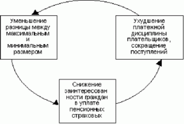 Законодательная и исполнительная власти вполне обоснованно стремятся не допустить снижения минимального размера пенсий ниже прожиточного минимума пенсионера. При имеющей место нехватке финансовых ресурсов внутри пенсионной системы это приводит в конечном итоге к их перераспределению от получателей максимальных пенсий к получателям минимальных. Как следствие снижается зависимость размера пенсии от продолжительности трудового стажа и среднего заработка человека, выходящего на пенсию (от суммы уплаченных пенсионных страховых взносов размер пенсии для наемных работников вообще не зависит). Это еще больше снижает заинтересованность в уплате страховых взносов. Работающие считают несправедливым назначение практически равных пенсий при неравном трудовом вкладе каждого. В результате усугубляется положение дел с уплатой страховых взносов в бюджет пенсионной системы, ее финансовое состояние ухудшается и цикл повторяется [4].