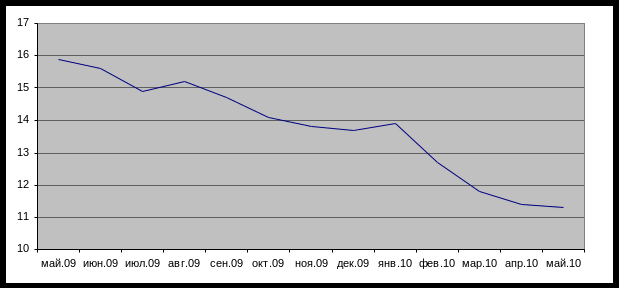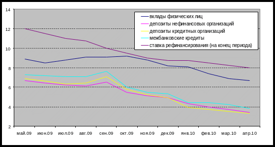 Среди причин, благоприятствующих снижению процентных ставок по кредитам в России с приблизительно 16% в мае 2009 года до около 11% в мае 2010 года (диаграмма 1) можно отметить 1) снижение процентных ставок по всем видам привлеченных обязательств, 2) снижение уровня задолженности кредитных организаций и 3) уменьшение в структуре обязательств доли «дорогих» обязательств.