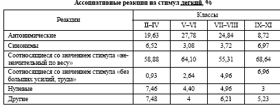 Доля антонимических реакций сравнительно небольшая и варьирует от 3 до 5%. Основным антонимом является слово «легкий». Испытуемые очень много приводят реакций-синонимов на стимул трудный. Доля синонимических реакций к старшим классам возрастает до 19, 55%.