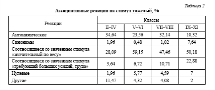 Как видно из приведенной табл. 1, доля антонимических реакций уменьшается к XI классу за счет возрастания доли реакций, соотносящихся со значением стимула «незначительный по весу» и «без больших усилий, труда». Реакции, соотносящиеся со значением стимула «незначительный по весу», преобладают во всех классах, что говорит о том, что данное значение является основным и первым, которое усваивается еще в начальной школе. Другое же значение является производным и более сложным для усвоения.