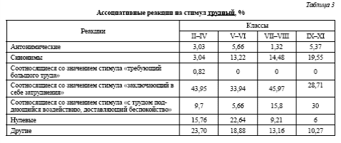 Реакции, соотносящиеся со значением стимула «требующий большого труда», почти не представлены в ассоциативном поле стимула трудный (доля таких реакций с V по XI классы составляет 0%, лишь в возрастной группе II–IV классы 0, 82%, но это единичная реакция). А вот две другие группы заслуживают пристального изучения. В начальной школе первичным значением является значение «заключающий в себе затруднения» (доля подобных реакций составляет 43, 95%). К старшим классам доля этих реакций значительно уменьшается – до 28, 71%; реакции, соотносящиеся со значением стимула «с трудом поддающийся воздействию, доставляющий беспокойство» к XI классу резко возрастают – с 9, 7 до 30%. К старшим классам усваивается такое значение слова, как «с трудом поддающийся воздействию, доставляющий беспокойство». Об этом же свидетельствует и анализ главных ассоциатов: если в начальной школе в число главных ассоциатов входили слова труд, день, задача, урок, то к старшим классам главной реакцией является реакция ребенок.