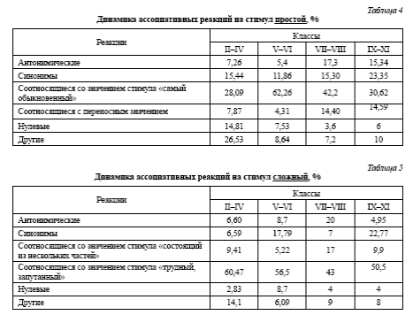 Составленные таблицы (1–5) демонстрируют динамику изменения доли реакций-антонимов и реакций-синонимов. Эти изменения происходят по-разному, поскольку динамика связана со значением исследуемых стимулов.