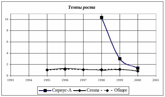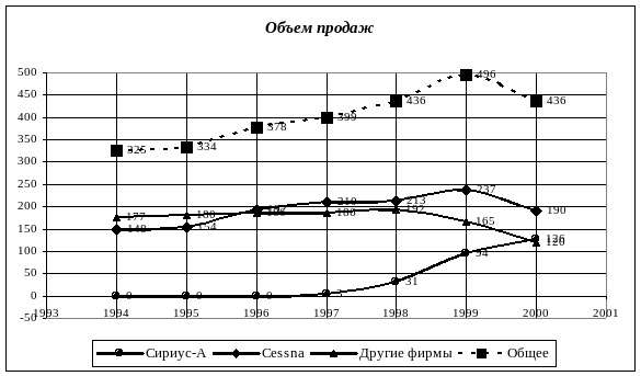 Из графиков видно, что объемы продаж предприятия Сириус-А на данном рынке растут. Растет и общий объем продаж, что свидетельствует о росте емкости рынка, о том, что данный рынок является перспективным, важным. По данным видно, что объемы продаж Сириуса-А растут быстрей основного конкурента компании Cessna т.е. постепенно Сириус-А захватывает все больший сегмент рынка, объем продаж конкурентов растет медленнее чем у нашей компании. Экстраполяция сделана по методу наименьших квадратов.