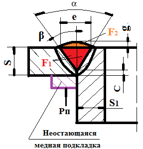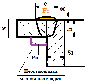 Поперечное сечение углового соединения без разделки кромок без зазора, выполненного односторонним швом на неостающейся медной подкладке (кольце). | Fн = F2, мм2; Fн = µн × e × g, мм2; µн ≈ 0,73; е = 1,3×S; g = 0,15×S; Рп – усилие прижима неостающейся медной подкладки (кольца). |